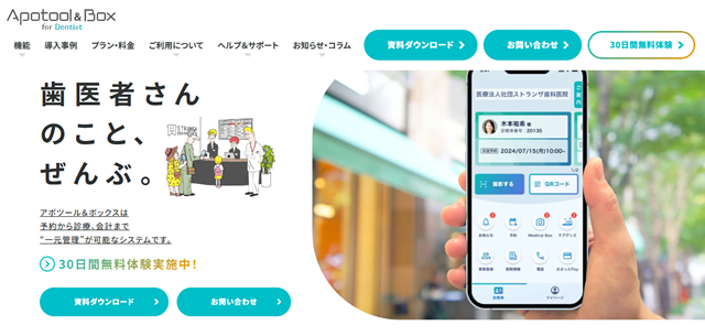 歯科医院向け予約管理システム「アポツール&ボックス」は運用管理が簡易的で、データ資産の活用等、経営に大いに役立つ管理システムです。また診療アプリ「私の歯医者さん」はキャンセル軽減、WEB予約の簡易化、来院自動受付、お知らせなど患者さんとのコミュニケーションに便利な機能が満載です。資料はこちらからご覧いただけます。